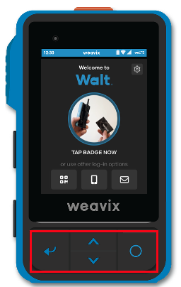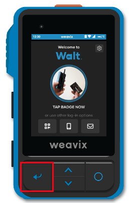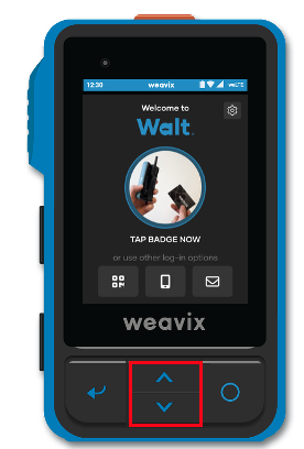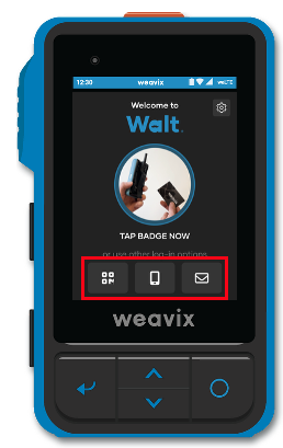 QR Code: Users with access to managing other users can display a login QR code from either the console or the weavix Mobile App. On your Walt, tap the QR code icon on the far left of the login screen, then scan the displayed code. This option is especially helpful if a user has misplaced or forgotten their NFC badge.